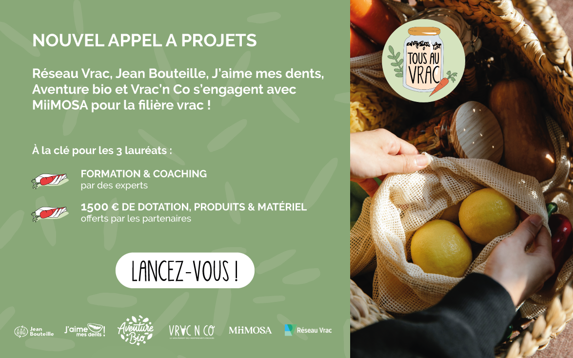 Cette année, Réseau Vrac et MiiMOSA lancent la troisième édition de l’appel à projets, soutenus par des partenaires de longue date comme Jean Bouteille et J’aime mes Dents, mais aussi plus récemment par Vrac’n Co et Aventure Bio qui ont rejoint l’opération cette année. Nous sommes très heureux que ces nouveaux partenaires puissent apporter leur soutien et leur expertise aux futurs porteurs de projets.