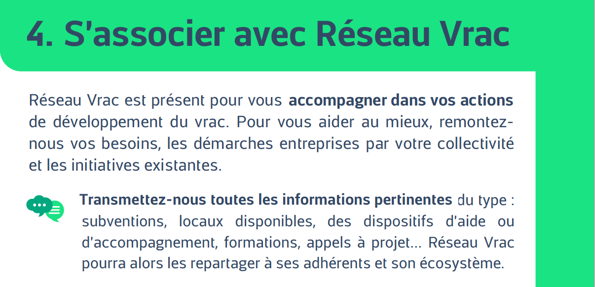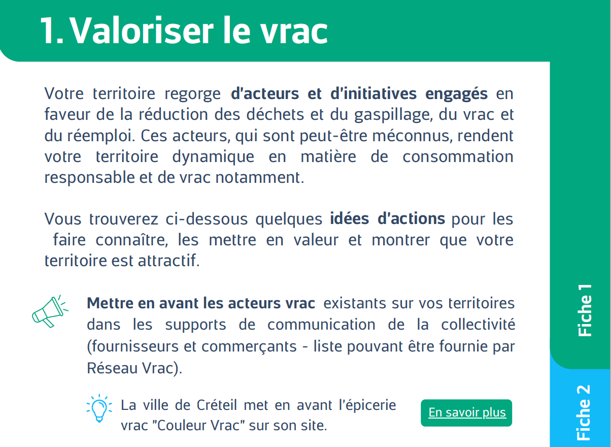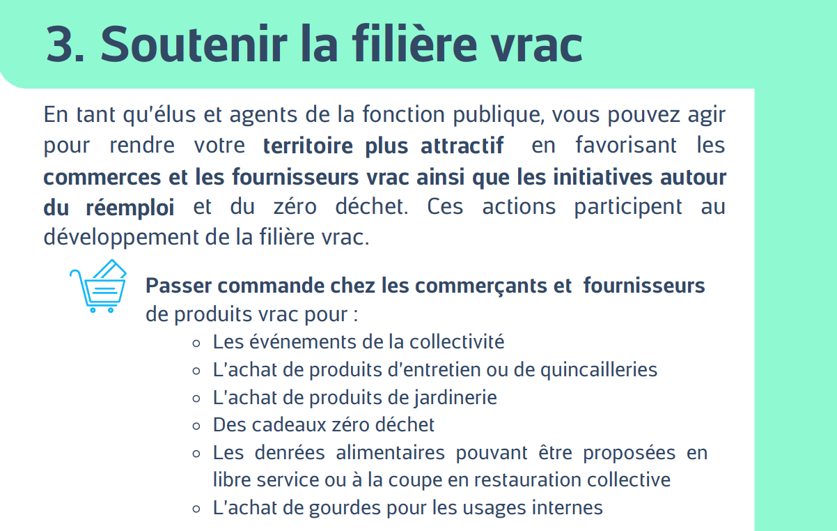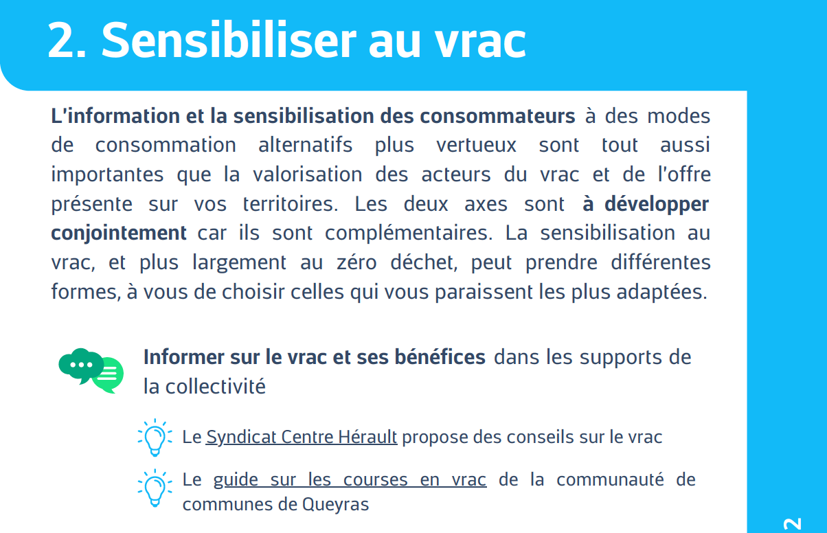 Dans ce guide de 30 pages, vous pourrez retrouver des fiches thématiques regroupant des idées d’actions concrètes, des retours d’expériences et des ressources pour promouvoir les acteurs vrac et aider au développement de l’offre vrac sur votre territoire. Pour vous donner une idée plus précise du contenu de cet outil, vous trouverez ci-dessous le sommaire détaillé de ce guide :