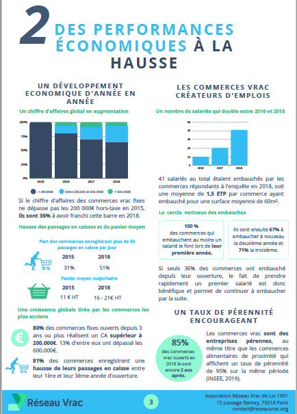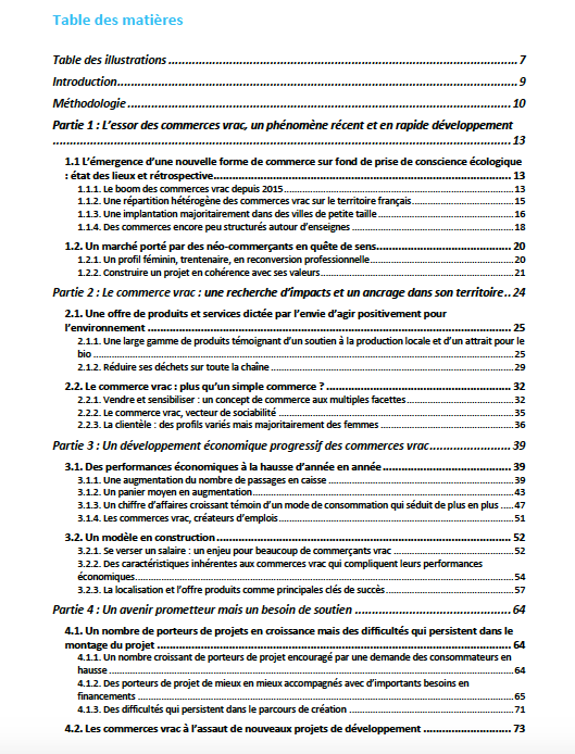 Organisé en 4 parties, le rapport complet s’attache tout d’abord à faire un état des lieux des commerces vrac en France avant d’étudier les caractéristiques des commerces et de leurs gérants. La troisième partie est consacrée aux données économiques (chiffre d’affaires, panier moyen, passages en caisse, emplois créés…). Le rapport se termine sur une partie prospective mettant en lumière des perspectives de développement encourageantes mais aussi les difficultés persistantes qu’il reste à lever pour pérenniser les commerces vrac partout sur le territoire.