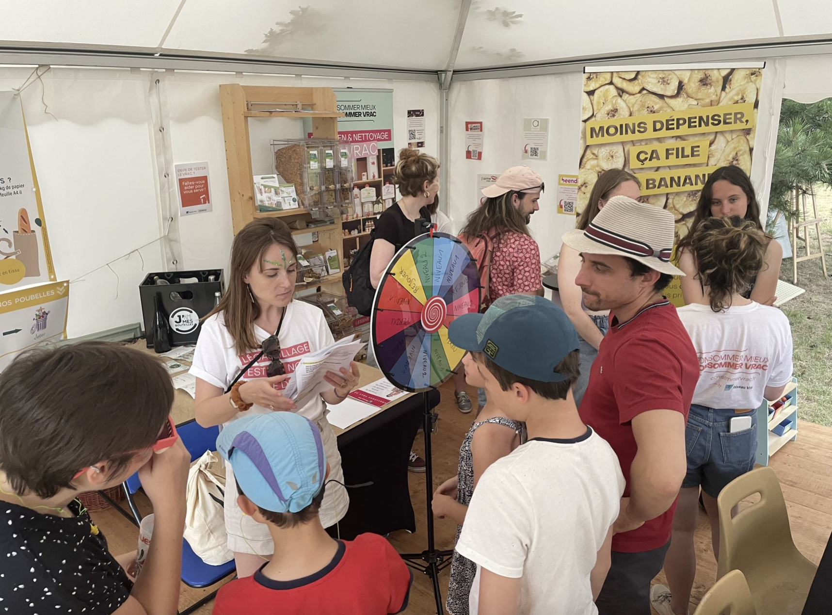 Ensuite, les participants ont pu tourner la roue du vrac et répondre à des questions liées au vrac. Ces dernières abordaient aussi bien : les avantages de la consommation vrac, que les pratiques liées à un achat en vrac, les impacts générés par les déchets des emballages jetables, notamment plastique, et des chiffres clés sur la filière vrac.
