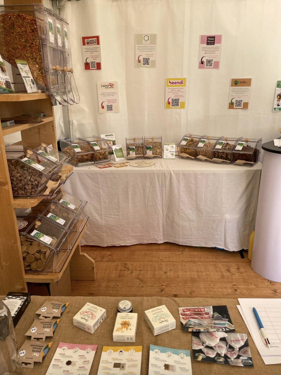 Nous avions mis en avant des visuels avec des QR répertoriant où les produits de nos fournisseurs étaient trouvables et également la cartographie des commerces vrac de notre site internet consommervrac.fr, avec un focus sur la région BFC.