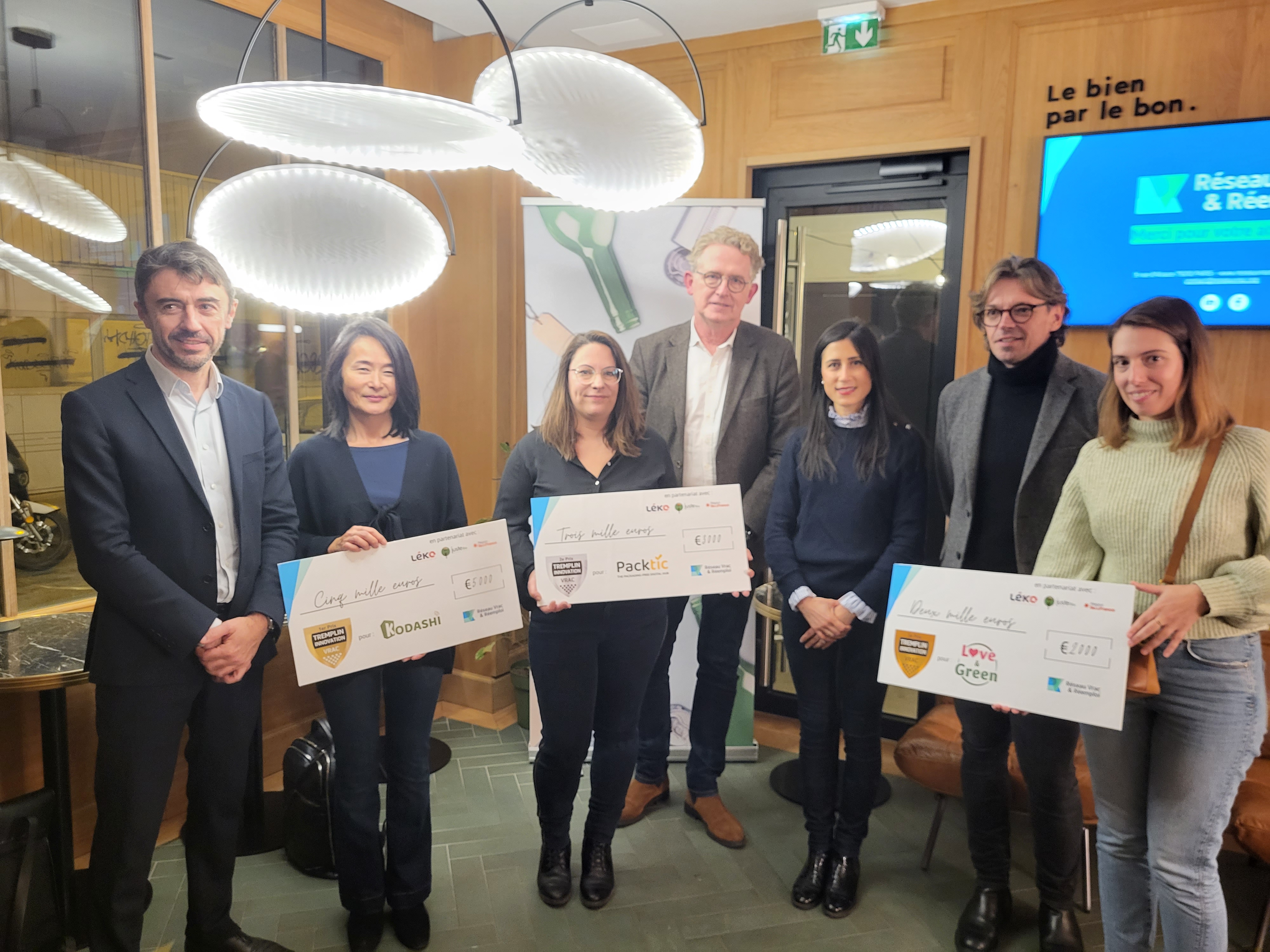 La révélation des gagnants a été faite lors de la cérémonie de clôture du 6 décembre au Bar Oé. Franck Bonfils (Président de Juste Bio), Patrick Bariol (DG de Leko) et Yann Wehrling (VP de la Région Ile-de-France à la transition écologique, au climat, la biodiversité et l’économie circulaire) ont dévoilés le nom des 3 lauréats :