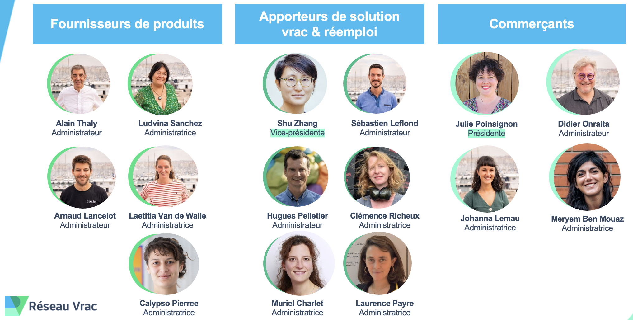 🌟 Réseau Vrac et Réemploi se dote d’un nouveau conseil d’administration représentatif des acteurs de la filière : fournisseurs de produits, apporteurs de solutions et commerces. Ce conseil d’administration sera présidé par Julie Poinsignon, co-fondatrice de l’épicerie des Julie, sera vice-présidé par Shu Zhang, co-fondatrice de Pandobac et composé de :