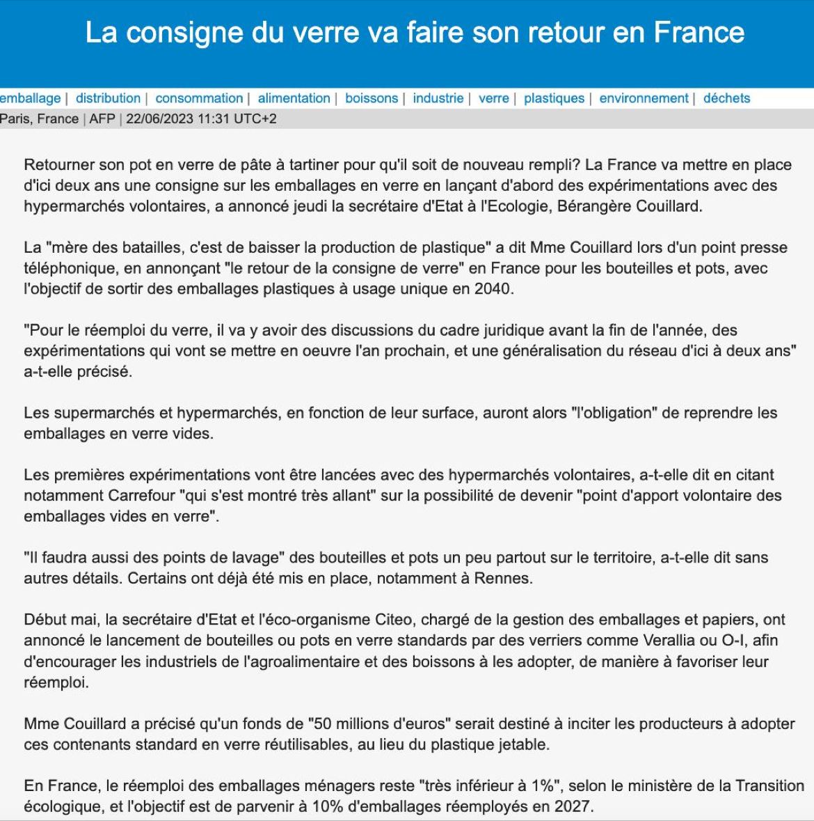 C’est avec satisfaction que nous accueillons aujourd’hui, jeudi 22 juin 2023, l’annonce du retour de la consigne du verre pour réemploi, avec l’objectif de la généraliser d’ici deux ans, par la secrétaire d’État à l’Écologie, Bérangère Couillard.